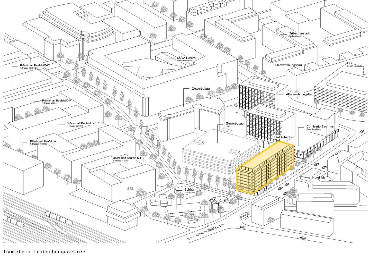 Mit dem neuen Stadthotel entsteht im aufstrebenden Tribschenquartier ein urbanes, auf das Quartier und Luzern abgestimmtes Stadthotel. Das Quartier erhält ein tolles, sichtbares Eingangs-Portal am Übergang von der Langensandbrücke zum Tribschenquartier. Das Stadthotel wird auch den Quartierbewohnenden offenstehen. Zur Verfügung stehen eine öffentliche Bar im Erdgeschoss, eine Kaffeelounge sowie belebte Begegnungszonen mit Arbeits-, Sitzungs- und Verweilmöglichkeiten. Das Hotel ersetzt unattraktiven und sanierungsbedürftigen grauen Bürobau aus dem Jahr 1975. Es hält sich bezüglich Höhe und Tiefe an die Dimensionen des heutigen Gebäudes.