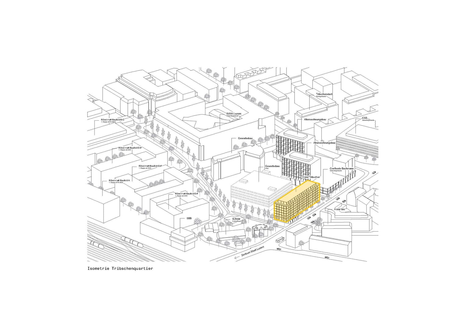 Mit dem neuen Stadthotel entsteht im aufstrebenden Tribschenquartier ein urbanes, auf das Quartier und Luzern abgestimmtes Stadthotel. Das Quartier erhält ein tolles, sichtbares Eingangs-Portal am Übergang von der Langensandbrücke zum Tribschenquartier. Das Stadthotel wird auch den Quartierbewohnenden offenstehen. Zur Verfügung stehen eine öffentliche Bar im Erdgeschoss sowie belebte Begegnungszonen mit Arbeits-, Sitzungs- und Verweilmöglichkeiten. Das Hotel ersetzt einen unattraktiven und sanierungsbedürftigen grauen Bürobau aus dem Jahr 1975. Es hält sich bezüglich Höhe und Tiefe an die Dimensionen des heutigen Gebäudes.